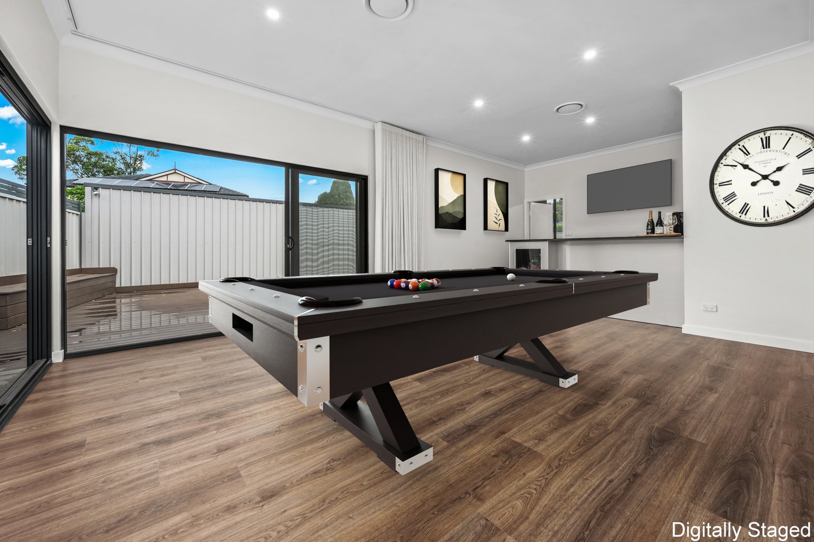 Inside, the spacious layout features five bedrooms, multiple living zones, and a central family area flowing through to the outdoor entertaining spaces. The inviting living area includes a combustion fireplace, creating a warm and cosy atmosphere during the cooler months.