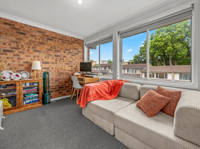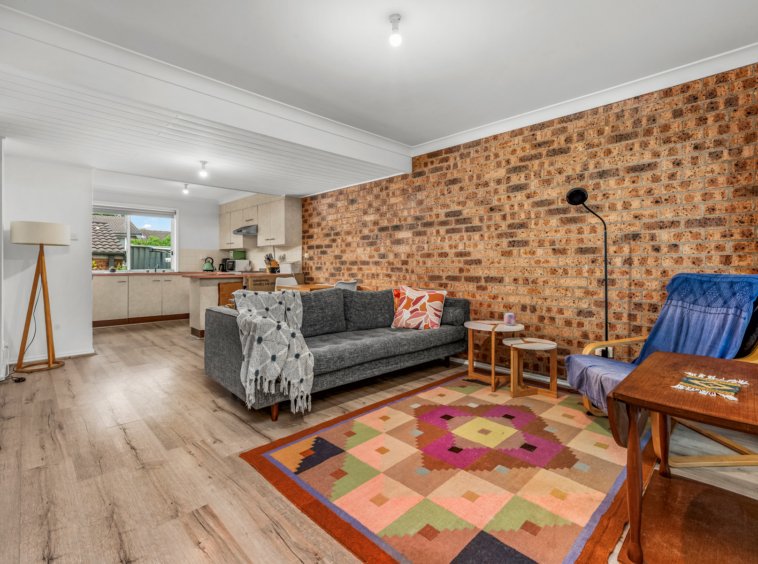 The home features two generously sized bedrooms, both with built-in wardrobes, a neat and functional bathroom, and a practical layout designed for everyday comfort. Neutral colour tones, exposed brick feature walls, and large windows throughout create a bright and welcoming atmosphere, while the open-plan living and dining area provides a comfortable space to relax or entertain.