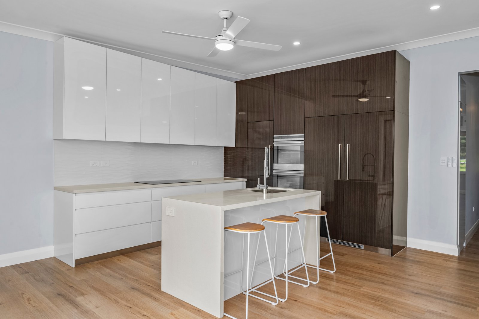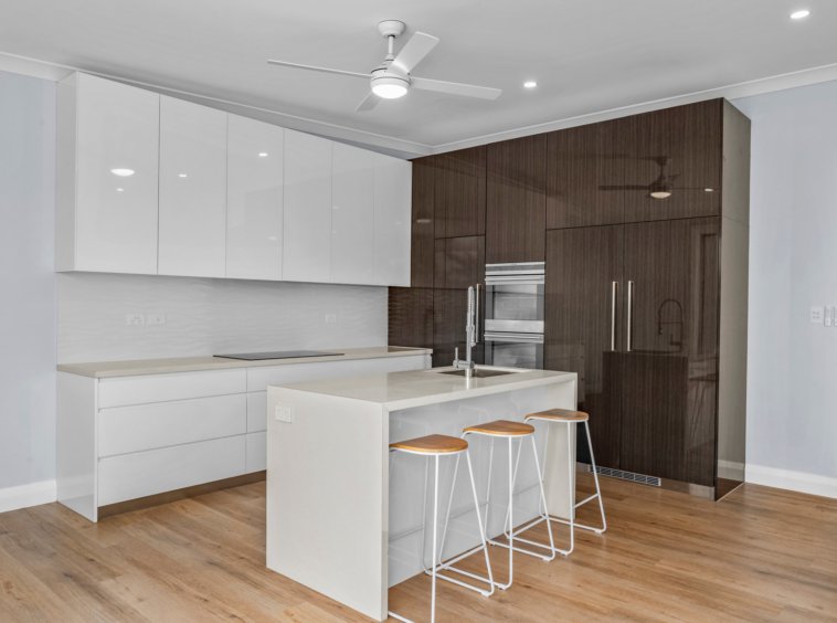 High ceilings and large updated windows create an immediate sense of space, and natural light fills the interiors throughout the day. The contemporary kitchen is beautifully integrated and features an induction cooktop, integrated fridge/freezer, and dishwasher, providing a seamless and stylish hub for everyday living and entertaining.
